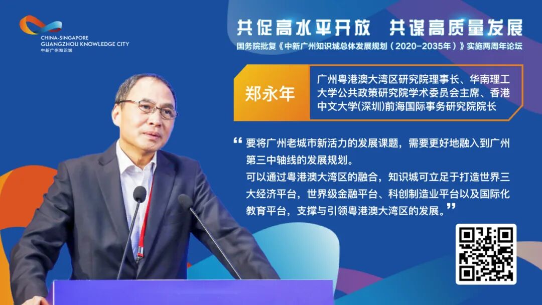 本文系郑永年教授在2022年8月26日《中新广州知识城总体规划(2020-2035))》实施两周年论坛上的发言实录。我觉得中新广州知识城,不仅仅是一个广州项目,而是一个国家项目。大家要注意到,中新知识城是一个长久规划。中新知识城不仅仅面临2035年的社会主义现代化问题,而且还是提前15年实现全面社会主义现代化强国的样本。中新广州知识城已经取得了很多成绩,产业方面有了很大进展,问题是如何面向未来?我们面临新的国际格局,新冠即将过去,俄乌战争还在进行,美国在加紧对中国的系统脱钩,在高新技术领域对我们卡脖子。我们自己国家内部也是在发展,也面临比较严峻的挑战,尤其是如何确保经济的高质量发展。所以我觉得中新知识城的发展要放到时代的大环境中看,我们既要为某些方面所取得的成绩都感到骄傲,我们也要看到自己的不足。中新知识城有哪些领域可以改进?我个人觉得,如果与苏州工业园比较,中新知识城还有很多改进空间。中新两国合作的苏州工业园是1994年建立的,当时目的是要改善中国工业化,所以叫工业园。从这个角度来说,苏州工业园区在中国工业化方面确实扮演着领军的角色,无论吸引外资,还是国家的产业升级,苏州工业园模式的辐射、扩散都做得很好。广州是知识城,知识城必须名副其实,我觉得还有很大的提升空间。我们要提升广州的产业,可以思考将中新知识城作为一个可复制、可推广、可辐射的改革开放范式。对于未来的发展,我觉得知识城已经有很好的基础,我提几点意见:一是知识城需要结合广州的新发展计划。广州正在规划未来城市发展的第三条轴。广州的城市第一轴是保护起来的老城,第二条轴是金融中心,目前已经饱和。广州下一步要发展,需要思考规划第三轴,北起知识城,南到南沙,以科创轴线带动未来广州的城市发展。总书记对广州提出了老城市新活力的要求,可以考虑通过这条科创第三轴来破题。 ![]()