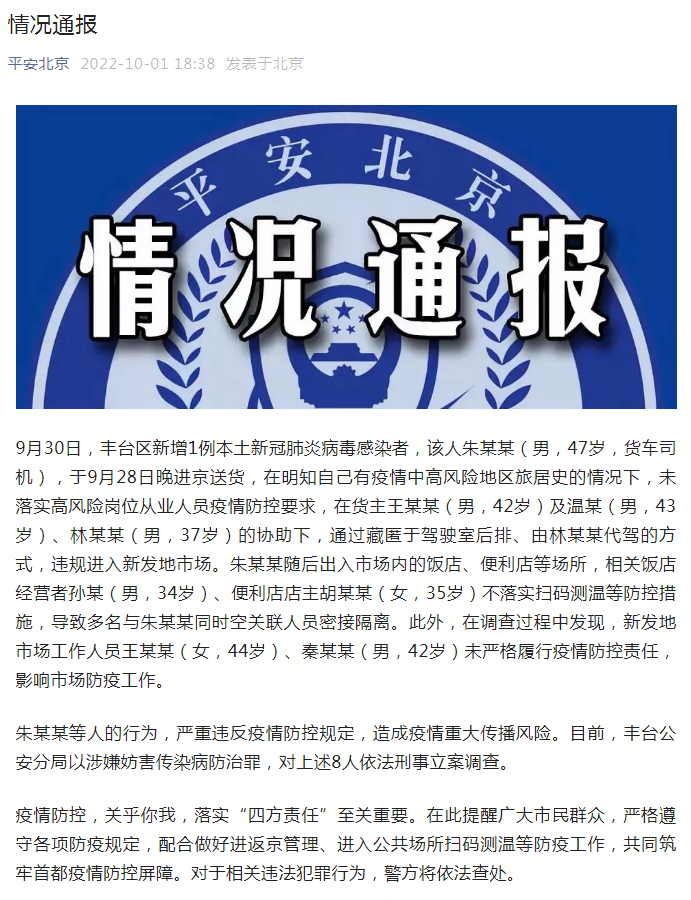 9月30日,丰台区新增1例本土新冠肺炎病毒感染者,该人朱某某(男,47岁,货车司机),于9月28日晚进京送货,在明知自己有疫情中高风险地区旅居史的情况下,未落实高风险岗位从业人员疫情防控要求,在货主王某某(男,42岁)及温某(男,43岁)、林某某(男,37岁)的协助下,通过藏匿于驾驶室后排、由林某某代驾的方式,违规进入新发地市场。朱某某随后出入市场内的饭店、便利店等场所,相关饭店经营者孙某(男,34岁)、便利店店主胡某某(女,35岁)不落实扫码测温等防控措施,导致多名与朱某某同时空关联人员密接隔离。此外,在调查过程中发现,新发地市场工作人员王某某(女,44岁)、秦某某(男,42岁)未严格履行疫情防控责任,影响市场防疫工作。