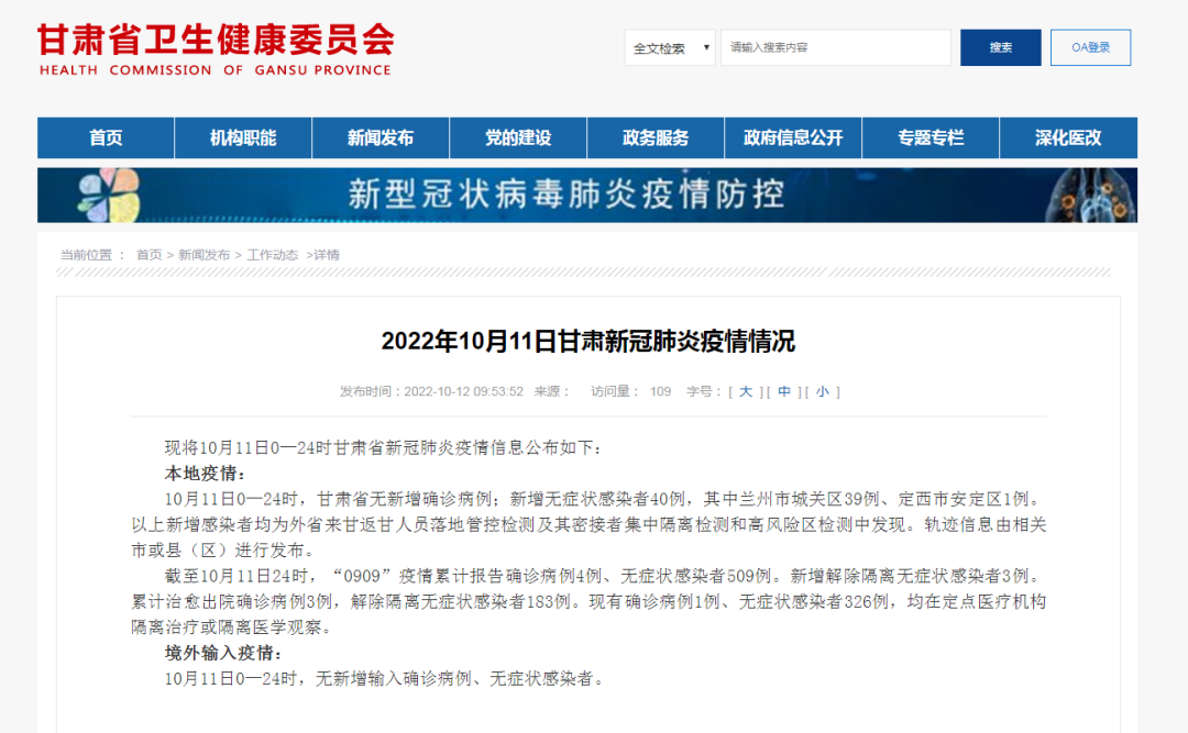 2022年10月11日甘肃新冠肺炎疫情情况
