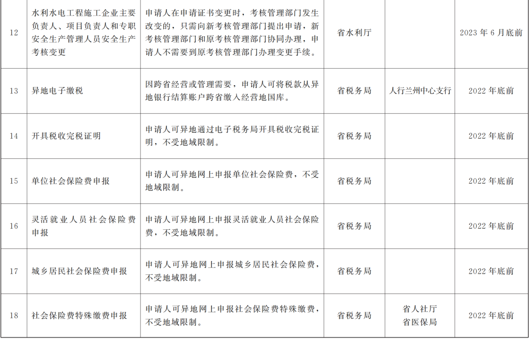 为认真贯彻落实《国务院办公厅关于扩大政务服务“跨省通办”范围进一步提升服务效能的意见》(国办发〔2022〕34号,以下简称“国办发34号文件”),积极推进更多高频政务服务事项“跨省通办”,进一步提升服务效能,增强企业群众异地办事便捷度,有力支撑经济社会高质量发展,现将有关事项通知如下。 一、高标准推进实施新增“跨省通办”事项。各地各有关部门要在继续深入落实《国务院办公厅关于加快推进政务服务“跨省通办”的指导意见》(国办发〔2020〕35号)的基础上,按照国办发34号文件部署要求,以利企便民为导向,细化具体推进落实举措,不断扩大“跨省通办”事项范围。省直有关部门和中央在甘有关单位要认真对照政务服务“跨省通办”新增任务清单(见附件)部署的22项新增“跨省通办”事项,严格按照明确的应用场景、责任分工和完成时限抓好落实;要主动加强与国务院有关部门的沟通衔接,按照国家层面统一部署要求,规范事项名称、办理流程等要素,同步指导市级行业部门将相关政务服务事项纳入本级政务服务中心办理。各市(州)、兰州新区要聚焦关中平原、兰州—西宁等城市群、都市圈一体化发展、主要劳务输入输出地协作、毗邻地区交流合作等需求,积极与兄弟城市开展政务服务“跨省通办”合作,科学推动医疗、养老和市场主体登记注册等更多与企业发展、群众生活密切相关的高频政务服务事项“跨省通办”;要继续加强与相关省份对接协作,扩大“丝路通办”、黄河流域省会城市商事登记“跨省通办”等合作范围。 二、统筹优化线上线下“跨省通办”服务。省大数据中心要会同各地各有关部门,依托全国和甘肃省一体化政务服务平台,加快整合网上办事入口,进一步统一身份认证、电子印章、电子证照、数据共享等体系,减少页面跳转,简化政务服务“跨省通办”网上办理环节和流程,在显著位置提供网上办事指引,拓展智能客服功能;要继续完善甘肃省一体化政务服务平台“跨省通办”服务专区功能,将更多“跨省通办”事项纳入专区办理;要加快提升“甘快办”APP政务服务能力,汇聚高频“跨省通办”事项,推动实现“掌上办”。省、市、县级政务服务中心要持续推进“跨省通办”窗口建设,在加快实现“全覆盖”的基础上,组织协调“跨省通办”业务相关入驻部门建立完善收件、办理协同联动工作机制,为全程网办提供业务咨询、申报辅导、沟通协调等服务,同步推行帮办代办、引导教办和特殊群体等服务,切实解决线上好办、线下难办问题。省、市级政务服务中心要依托全国和甘肃省一体化政务服务平台,继续加强政务服务“跨省通办”业务受理系统建设,完善异地代收代办、多地联办服务功能,主动与相关省、市建立线上审核、视频会商等工作联络机制,切实减少“跨省通办”事项受理、收办件审核和补齐补正次数及资料传递、审查、核验、送达时长,推进“跨省通办”高效协同;省、市级业务主管部门要结合工作实际,加强相关业务指导和培训。各市、县政务服务中心要组织乡镇(街道)便民服务中心、村(社区)便民服务站发挥省级统一配备的政务服务一体机作用,实现“跨省通办”“就近办”。 三、持续提升“跨省通办”服务支撑能力。省直有关部门、中央在甘有关单位要加强与国务院有关部门的沟通衔接,及时了解全国统一的政务服务事项基本目录和实施清单编制工作进展情况,按国家有关部门制定的政务服务“跨省通办”事项标准和业务规则,同步更新“跨省通办”事项名称、编码等基本要素,统一受理条件、服务对象、办理流程、申请材料、办结时限、办理结果等,完善全程网办、异地代收代办、多地联办等业务标准和流程,对申请表单、材料和办事指南等进行规范。省大数据中心要组织各地各有关部门进一步加强政务服务“跨省通办”平台和系统建设,持续提升甘肃省一体化政务服务平台对“跨省通办”业务的支撑能力,加快与国务院部门垂直管理业务信息系统和省直有关部门自建业务信息系统的深度对接联通,探索开发完善政务服务自助终端“跨省通办”功能。同时,要组织各地各有关部门加快推进甘肃省一体化政务服务平台数据汇聚共享,在做好数据信息保密和安全保障工作的基础上,将更多直接关系企业群众异地办事、应用频次高的医疗、养老、住房、就业、社保、户籍、税务等领域数据纳入共享范围,依法依规有序推进电子证照、电子印章、电子签名应用和共享互认,更好发挥数据赋能作用。除现行法律法规另有规定或涉及国家秘密和安全等外,省直有关部门一律面向市州提供履行职责需要的数据共享服务。 四、切实加强“跨省通办”组织保障工作。省政府办公厅(省大数据管理局)负责全省政务服务“跨省通办”的统筹协调,并将“跨省通办”工作落实情况作为“放管服”和行政审批制度改革督查、考核、评估的重点内容,及时发现问题并督促整改。省大数据中心要做好省级平台系统建设、技术支撑和业务咨询、指导、培训等工作,会同省直有关部门、中央在甘有关单位实时监测分析,运用特别呈报和全省网上政务服务综合监督管理平台等及时通报全省“跨省通办”工作进展情况,指导解决实际困难和问题。省直有关部门、中央在甘有关单位要按照国务院有关部门部署要求,认真做
