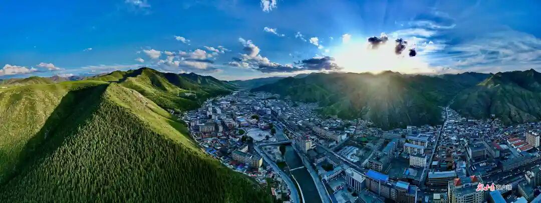 俯瞰夏河县城,四周色彩茏葱仿佛飞舞的彩带,襟起群峰绿色,起伏山野之间。新甘肃·甘肃日报记者 韦德占 摄