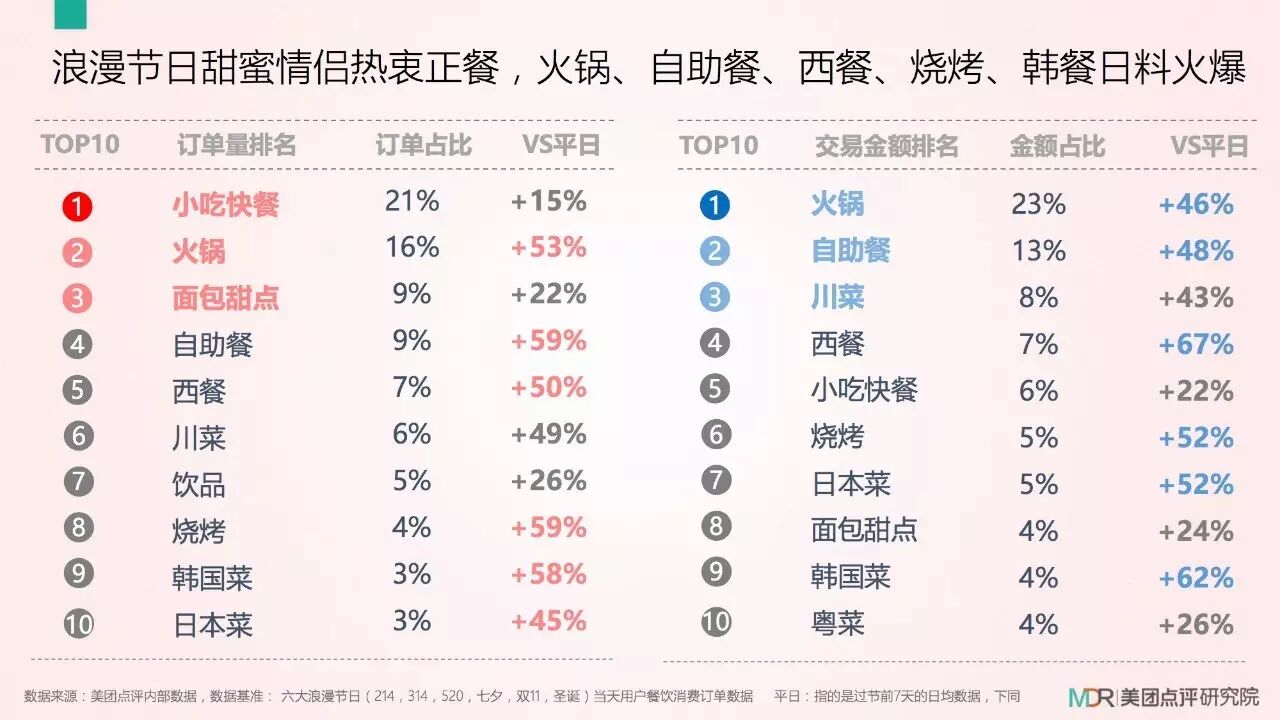 但是在这种特殊的节日里,小吃简快餐的订单增长远不如正餐品类,火锅、自助餐、西餐、日韩菜等5大正餐的订单量与平日相比,平均增长高达50%以上。