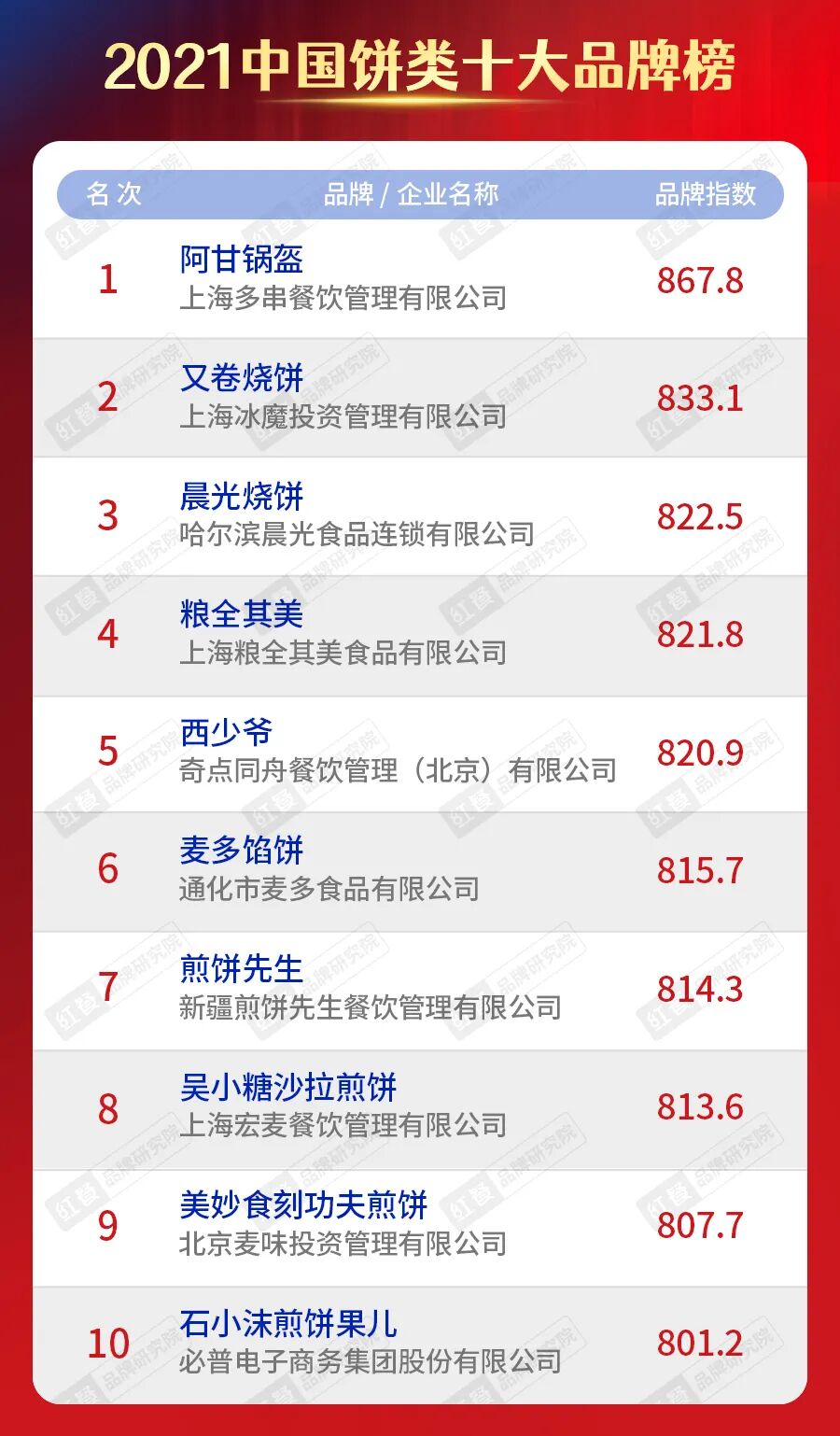 而在“2021中国饼类十大品牌”中,阿甘锅盔以绝对优势位列第一,其他品牌的品牌力尚需加强。