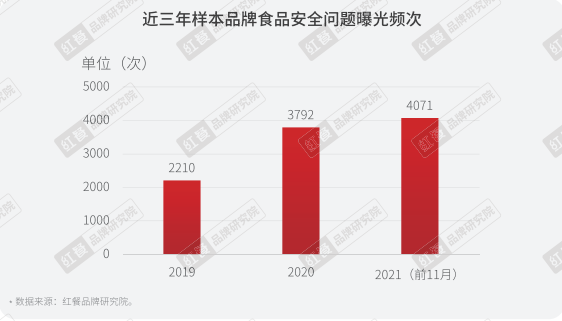 从2019年到2021年,食品安全问题曝光频次直线上升。截至2021年前11月,全国被披露的食品安全问题频次达到了4071个,较2020年增长了7.4%。