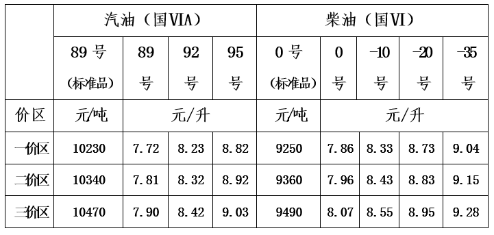 1、表中汽油和柴油价格为符合第六阶段强制性国家标准国ⅥA车用汽油和Ⅵ车用柴油价格。