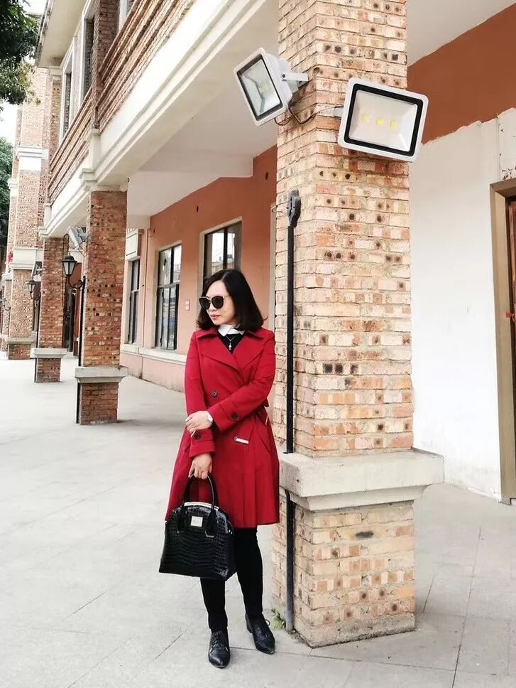 亮眼的红色长外套搭配墨镜