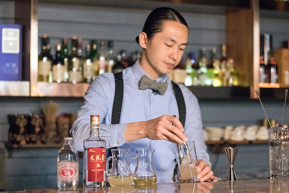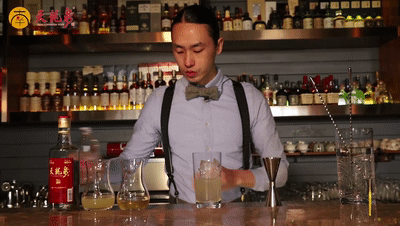 取45ml天龙泉加入杯中,搅拌均匀,加入冰块。其实不是所有的白酒都适合做鸡尾酒,因为我们此次选用的天龙泉只有22°,风味比较轻柔,所以作为白酒也比较适用于调制鸡尾酒。此外,天龙泉也可以用金酒或者威士忌替代~