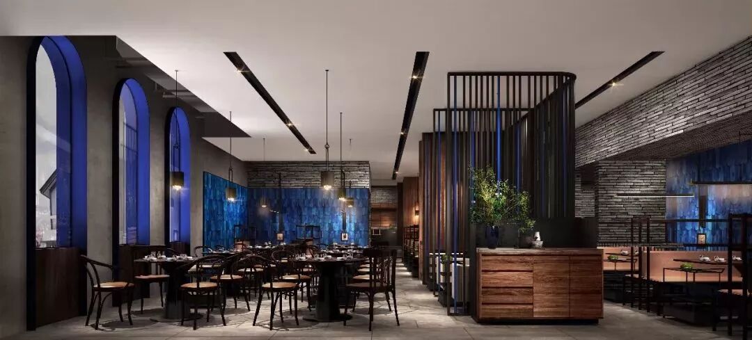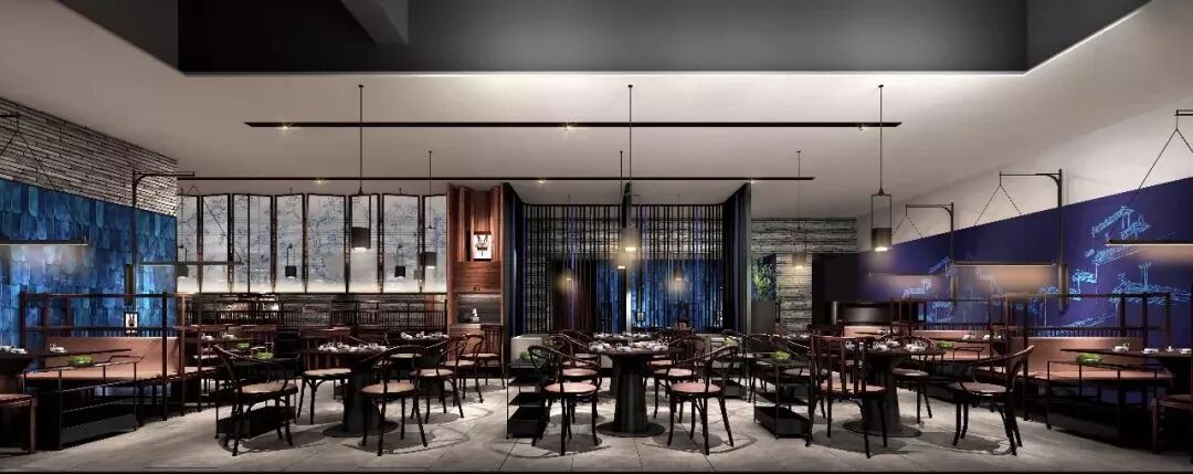 出了电梯后进入店里,却发现别有洞天。满眼的蓝墙灰砖、水墨玻璃屏风,还有墙上那不经意却独具巧思的瓷片装饰……