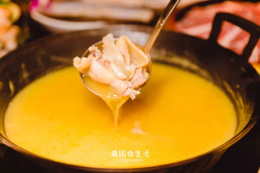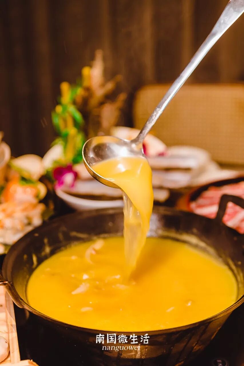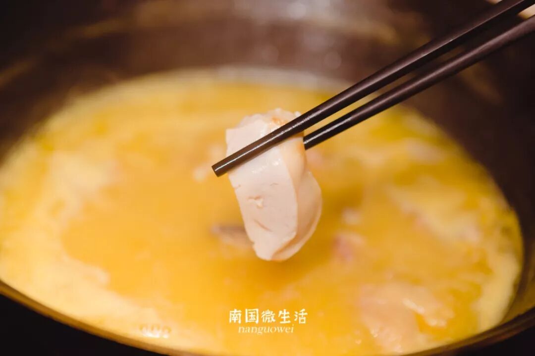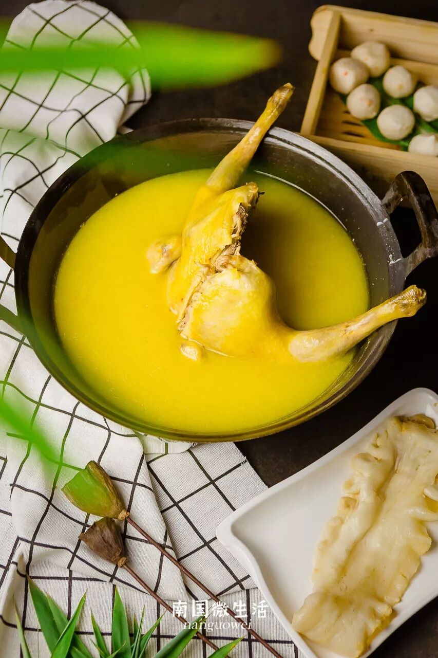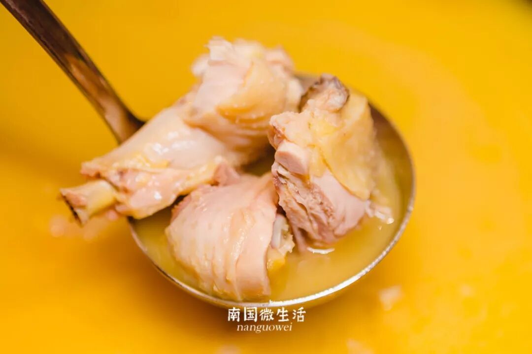 金黄的色泽是花费6小时将鸡肉与火腿、沙虫等30多种食材小火慢熬而成,每一块鸡肉都泛着晶莹的光泽。闻起来鲜香十足,但是不加任何调味剂,完全靠食材熬出的浓郁汤底,润胃无声。