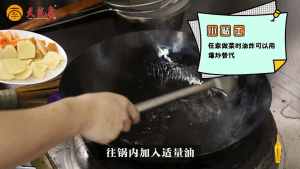 与此同时就可以来炸配菜了,往锅内加入适量油,油温烧至5成时,先下土豆块,后下胡萝卜块,炸至金黄,然后捞出控油。