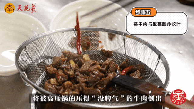 往锅内加入少许油,加入姜片、大蒜、焯过水的牛腩,再加入草果、干辣椒、陈皮、八角、桂皮等香料,以及糖、老抽、生抽、蚝油、啤酒、清水、生粉、鸡粉、味精炒出颜色,然后倒入高压锅。再往锅内加入少许油、豆瓣酱,适量清水,炒香后把酱汁也倒入高压锅内,盖上锅盖压30分钟。