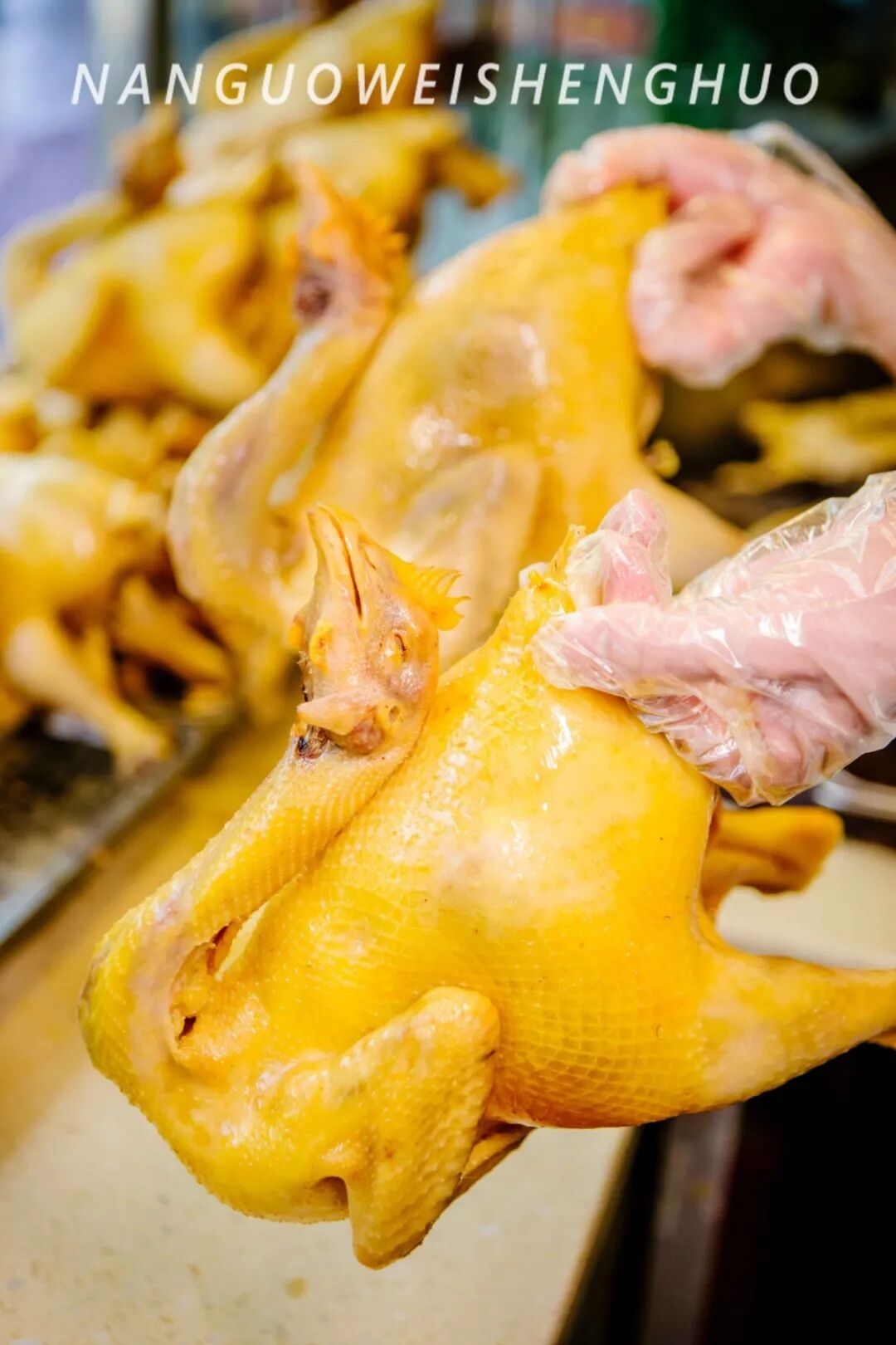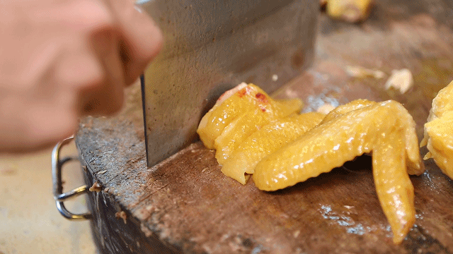 为了让鸡肉更加金黄油亮,摆放到档口前,要进行一番细致的“护肤” ,把花生油均匀地涂抹在鸡身上,将水分紧紧地锁住,保持鸡肉嫩滑的口感。