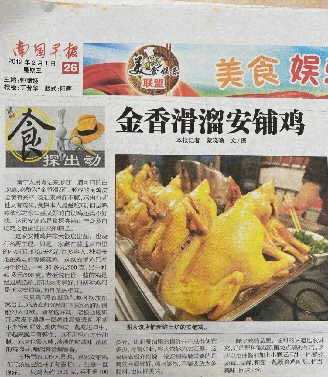 因为实力过人,它还曾被南宁主流媒体争相推介。大红底色、黄色文字的标志性招牌,深入人心,它就是“吾鹏安铺鸡”。