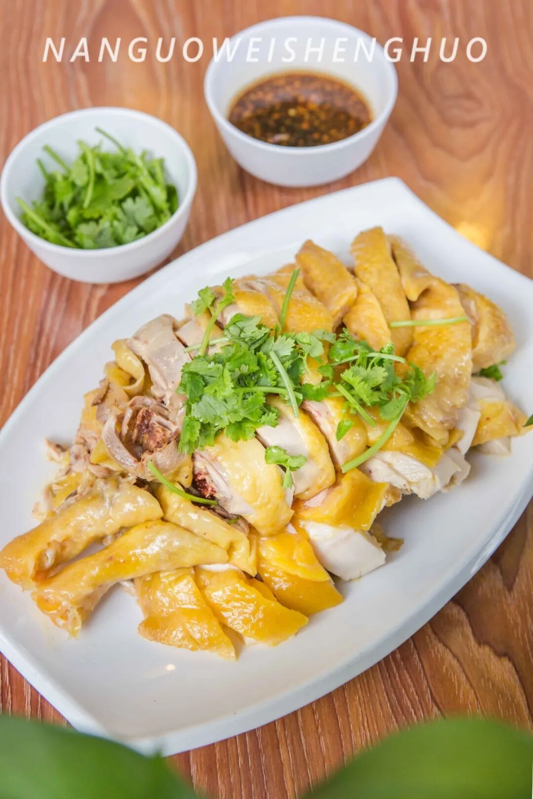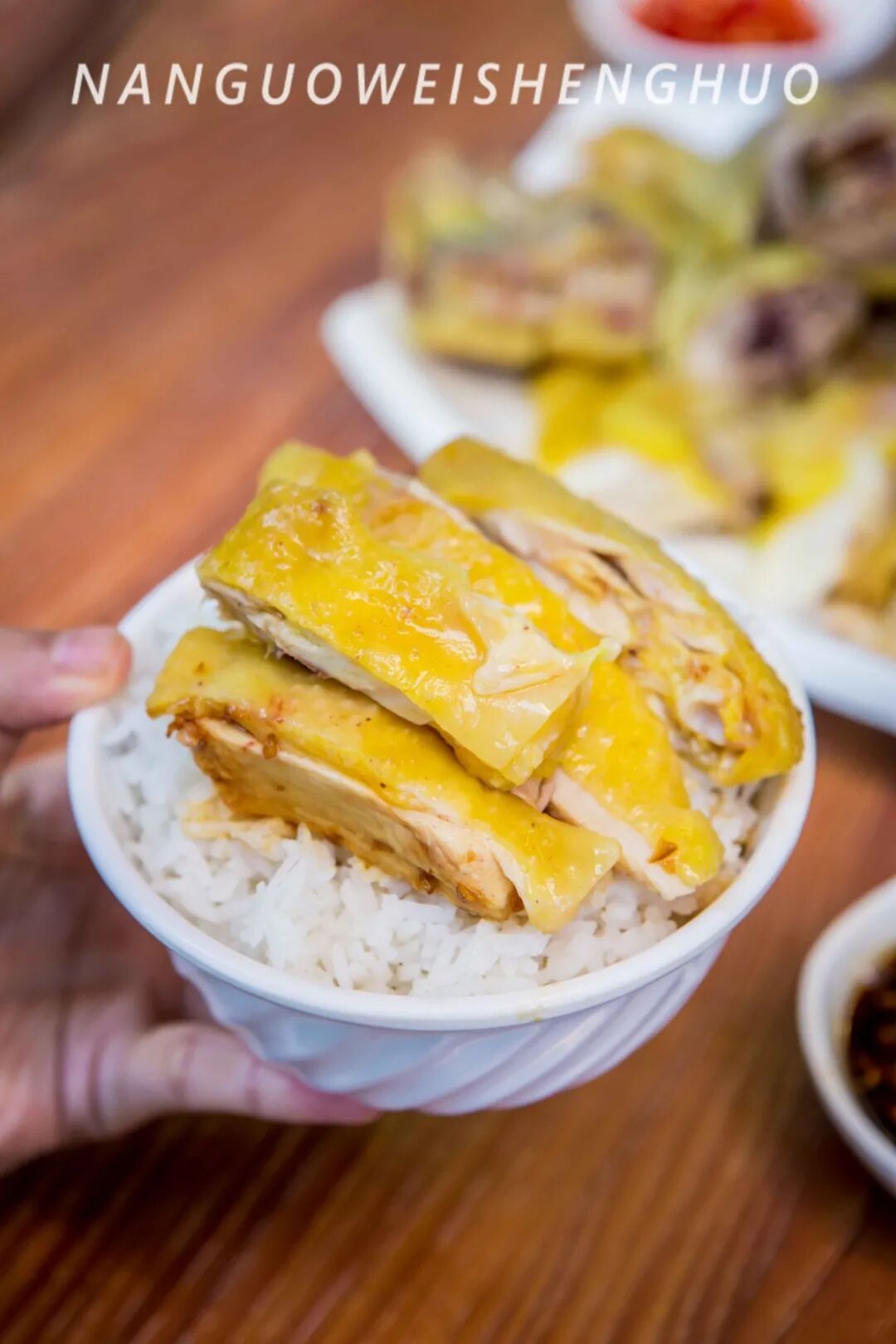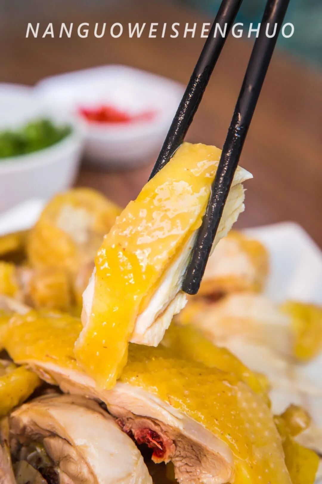 金黄的鸡皮薄薄一层附在鸡肉上,肉质嫩而不柴,入口是带了汁水的爽滑,直接吃已经很够味了,轻轻蘸一下由沙姜、酱油、花生油做成的简单味碟,鸡肉味道更是浓郁鲜美。