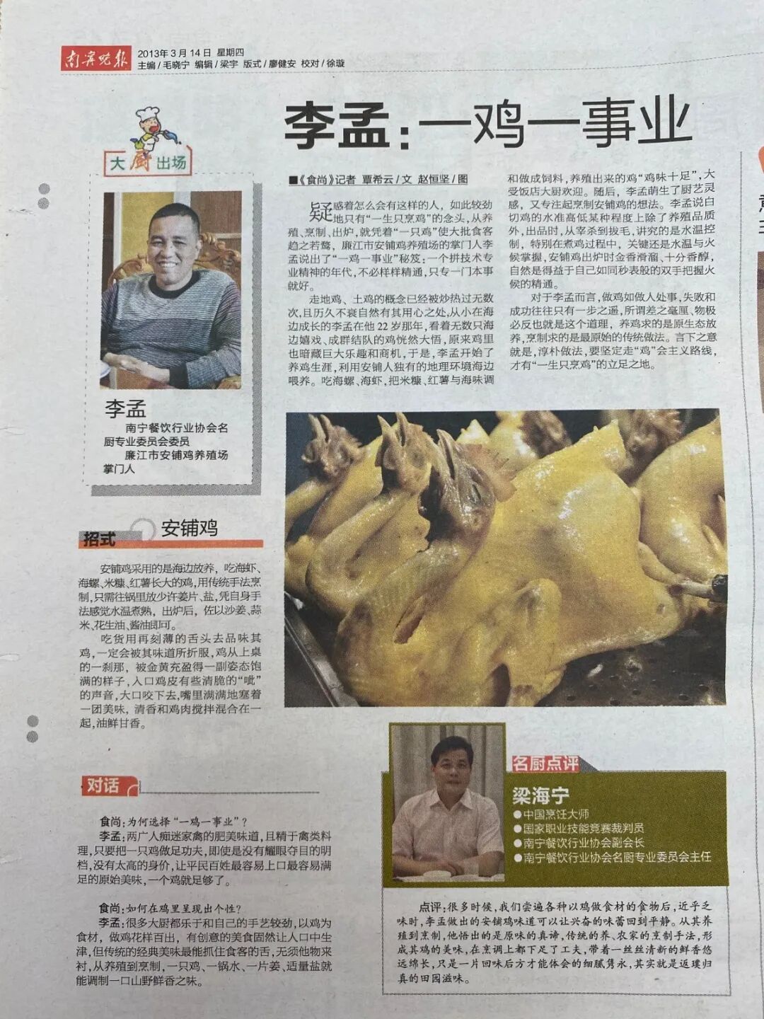 此后,他不满足仅经营活禽档口,还研究出一门烹饪安铺鸡的好手艺,开设安铺鸡档口,在“卧虎藏龙”的菜市里,凭着好口味让南宁人一吃难忘,也因此名声大噪。