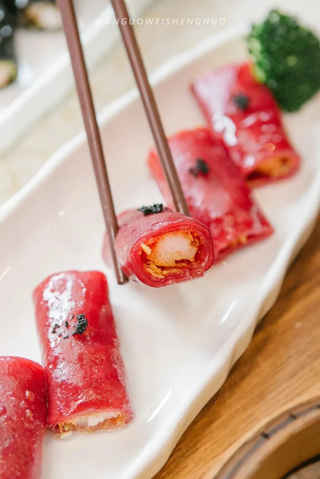 创意满满的肠粉,肠粉皮经过墨鱼汁的渲染