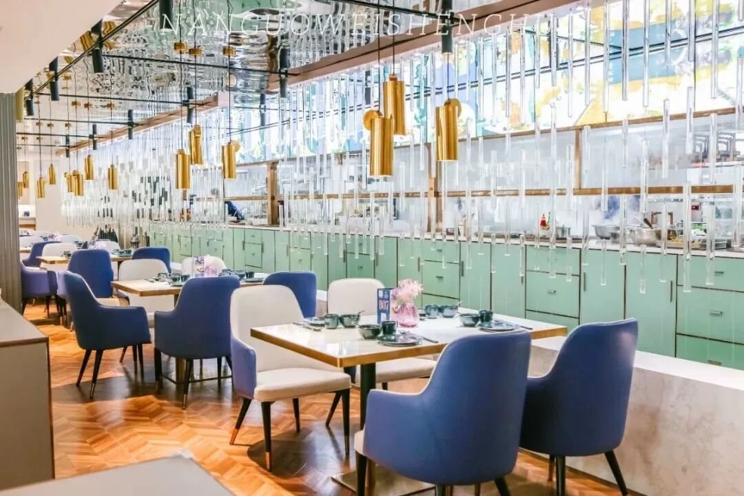 琉璃吊灯、复古蓝绒布桌椅、木质拱门……