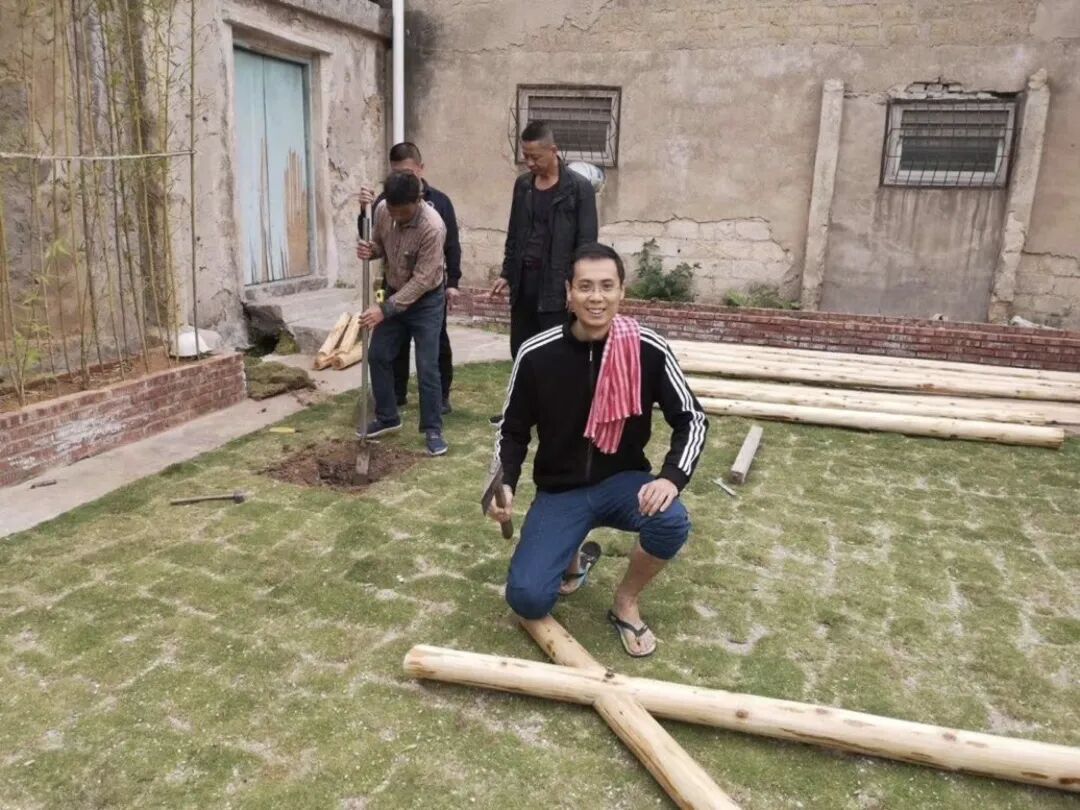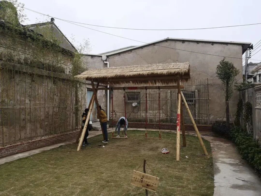 他很乐于参与到这件事情中,平时只在三尺讲台讲课的他,自己也拿起了锤子敲敲打打参与搭建,还特意托朋友从普宁快递来稻草加盖在秋千的顶上。看他这么郑重其事,再加上他满腹经纶,我还以为秋千顶上的稻草有特别的寓意讲究,他却只是淡淡地回答了两个字:“美观”。