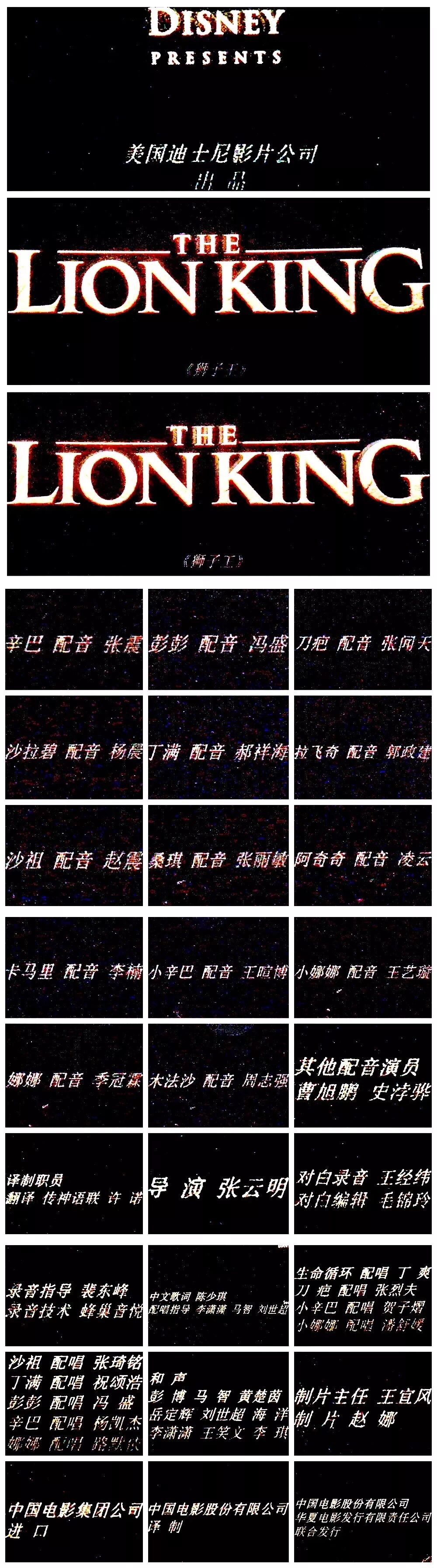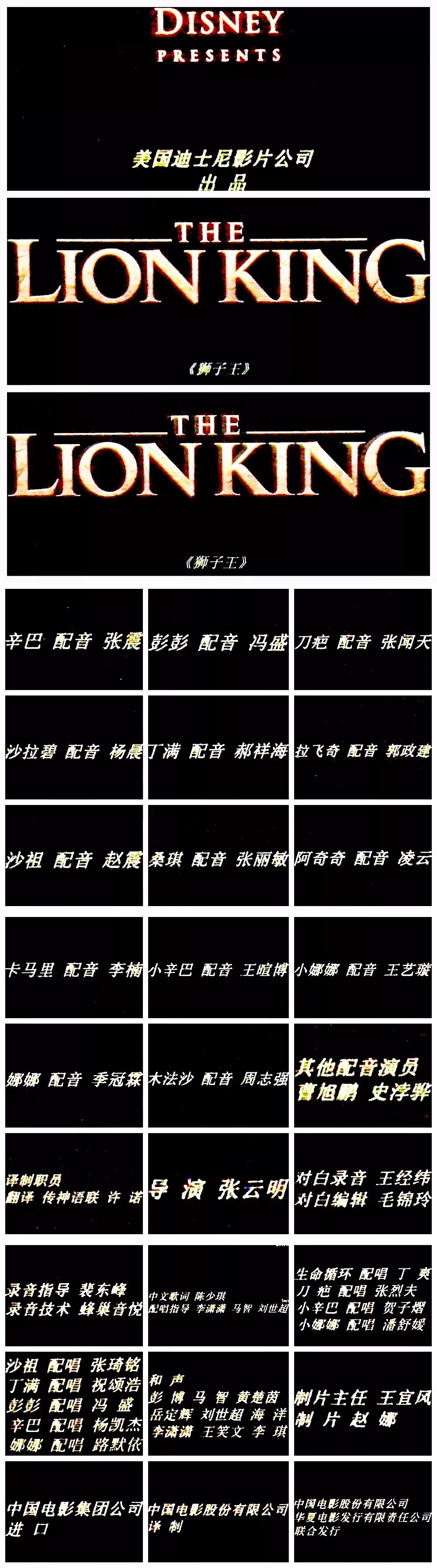 后来2015年左右,爱奇艺上线了三部曲的迪士尼官方认证内地配音版,从此《狮子王》第一部终于有了内地配音,印象中这版本是范哲琛配木法沙,路知行配辛巴,张震配刀疤,凌振赫配丁满,张遥函配彭彭。片头曲也是新作词,但当时因为台湾版深入我心的上述原因而忽略掉了。