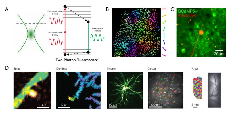D. 不同尺度上的双光子成像示意图(引自Scanziani et al., 2009 Nature)。