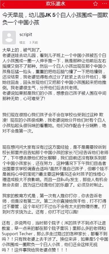近日,一条标题为《今天早晨,幼儿园JK 5个白人小孩围成一圈欺负一个中国小孩》的网文火遍了北美华人圈。