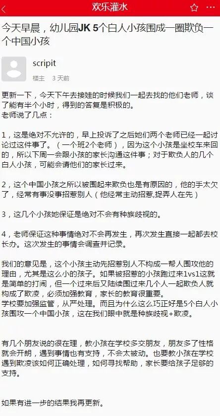 事情是这样的,楼主的太太早晨送孩子去幼儿园上学,正巧看到1个中国小孩被5个白人小孩围成一圈,并有推搡等动作。