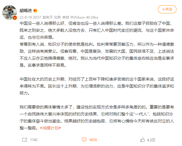 胡锡进网上发贴感慨: