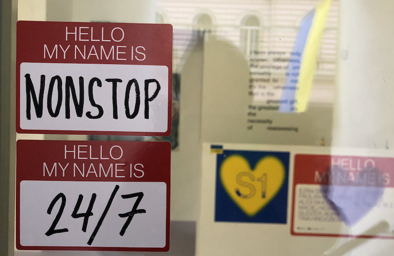 画廊门口已经挂上了乌克兰国旗,窗户上也贴上了蓝、黄的双色标志,门上贴上了简单的指示标,制作了晚间挂在门上的牌子,上面有值班人员的电话。门口的接待角,贴上了房间使用规则。