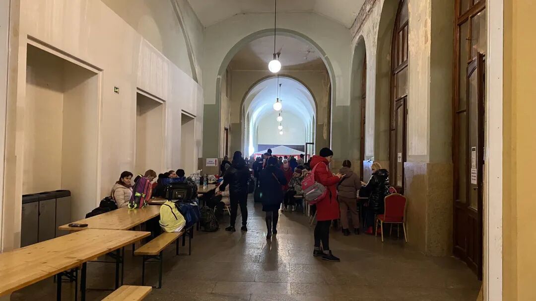 然后,我们去了大火车站。车站大厅有乌克兰语的接待中心指示箭头,站台出口处,有几个穿着应急背心的志愿者,举着蓝黄色指示牌,接应抵达的旅客。从站台出口的位置,上侧面的楼梯,就是专门划出来难民接待区,甬道里摆了二列长桌,不少家庭坐在那里休息,等待下一步的安排,当然,所谓家庭,全部是老人、女人、孩子,老人里面,我匆匆走过,印象中也都是女人。