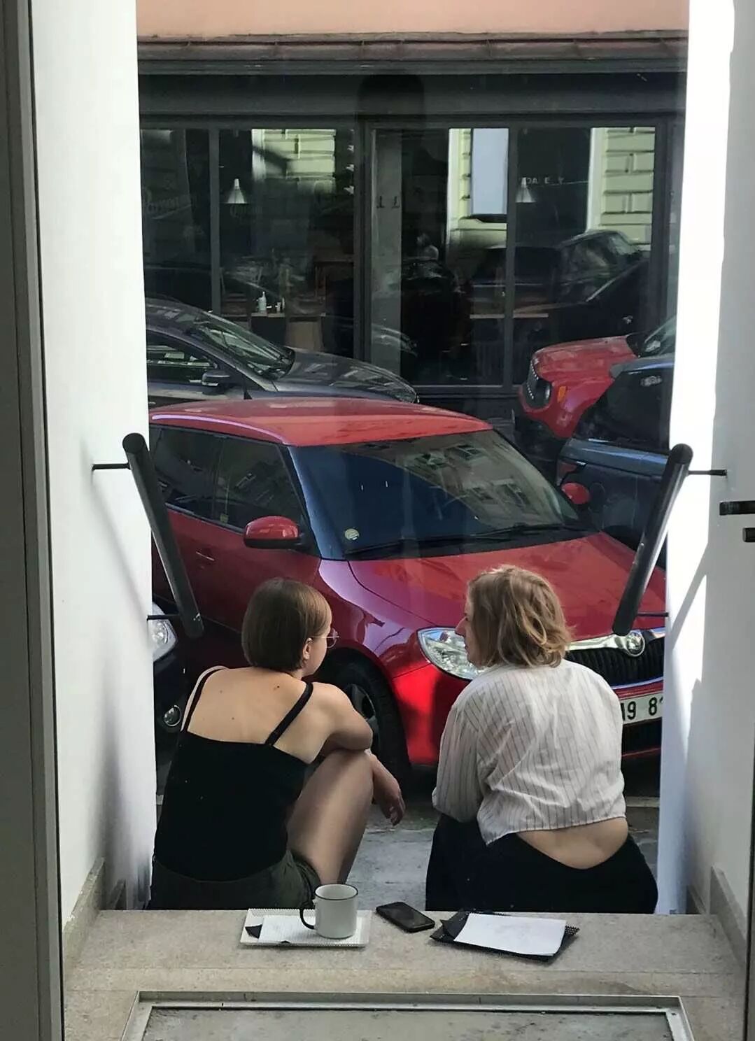 直到开幕,窗帘还没能完工,他们用黑色的胶带粘贴四面边框,为临街带着几扇高窗的墙面蒙上了整整一面半透明薄膜塑料布。
