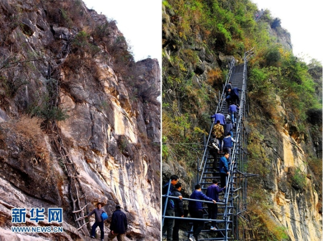 左图为2013年2月22日拍摄的“悬崖村”的藤梯;右图为2016年11月29日拍摄的人们沿着刚建好的钢梯登上“悬崖村”。新华网发(阿克鸠射 摄)