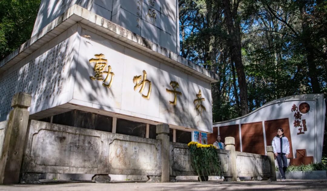 11月2日,南侨机工蒋印生的女儿蒋燕(右)在南洋华侨机工抗日纪念碑前参加悼念仪式。新华社记者 江文耀 摄