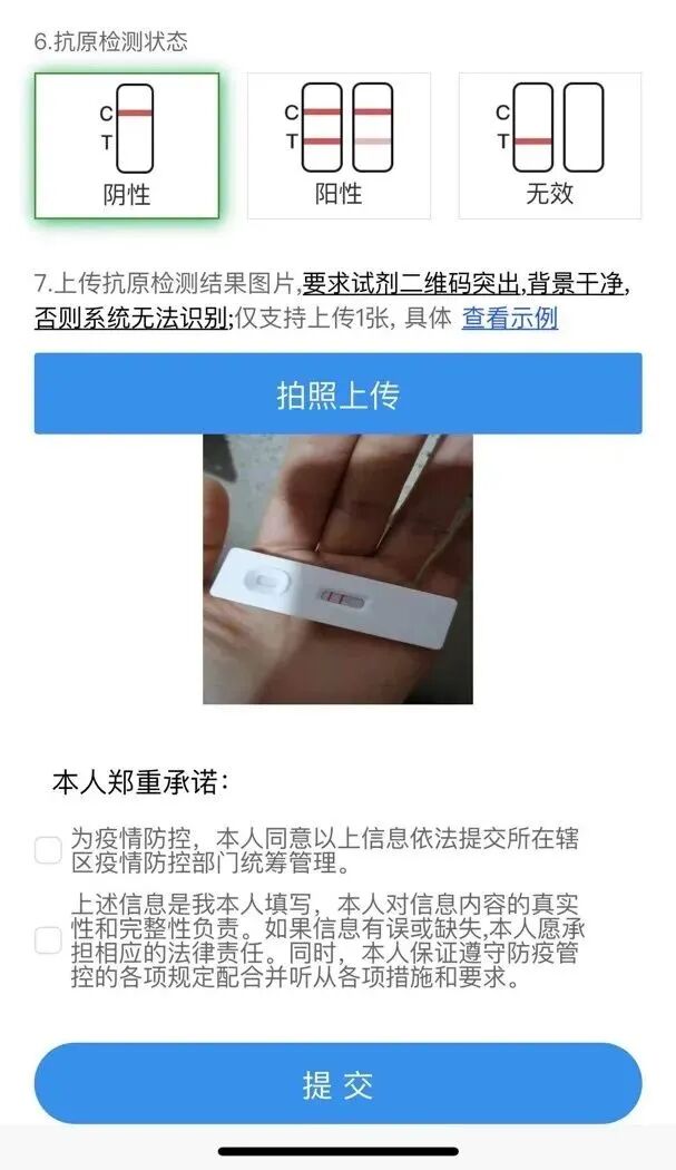 选择抗原检测状态(阴性、阳性、无效),拍照上传抗原检测结果图片,并仔细阅读勾选底部内容后,点击提交。
