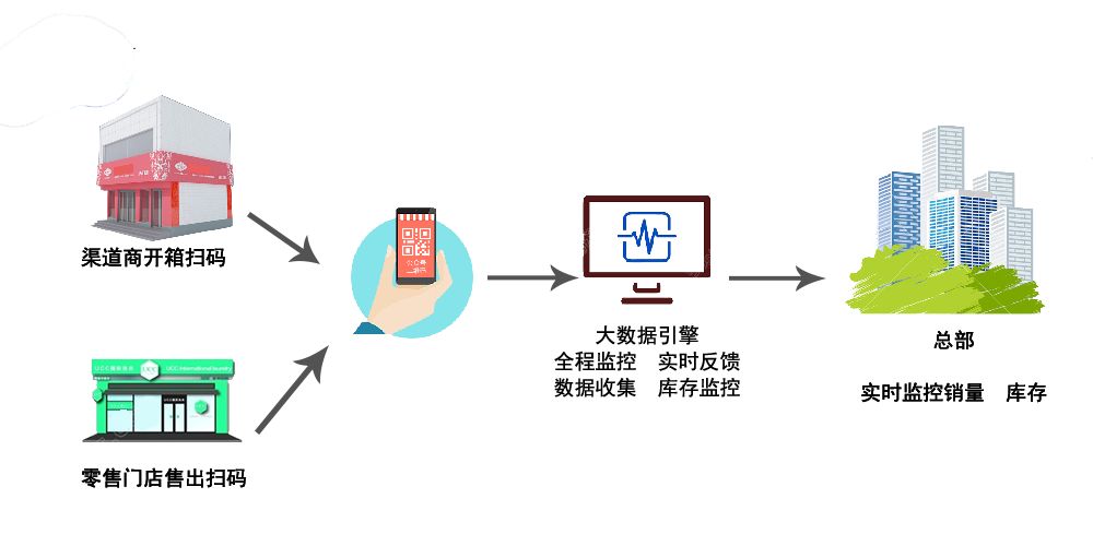 任何扫码行为,都会自动上传到总部的系统后台,品牌商可推断出货地区、产品动销区域的情况、零售门店数据等等,实现渠道管控、渠道动销、销量提升的效果。