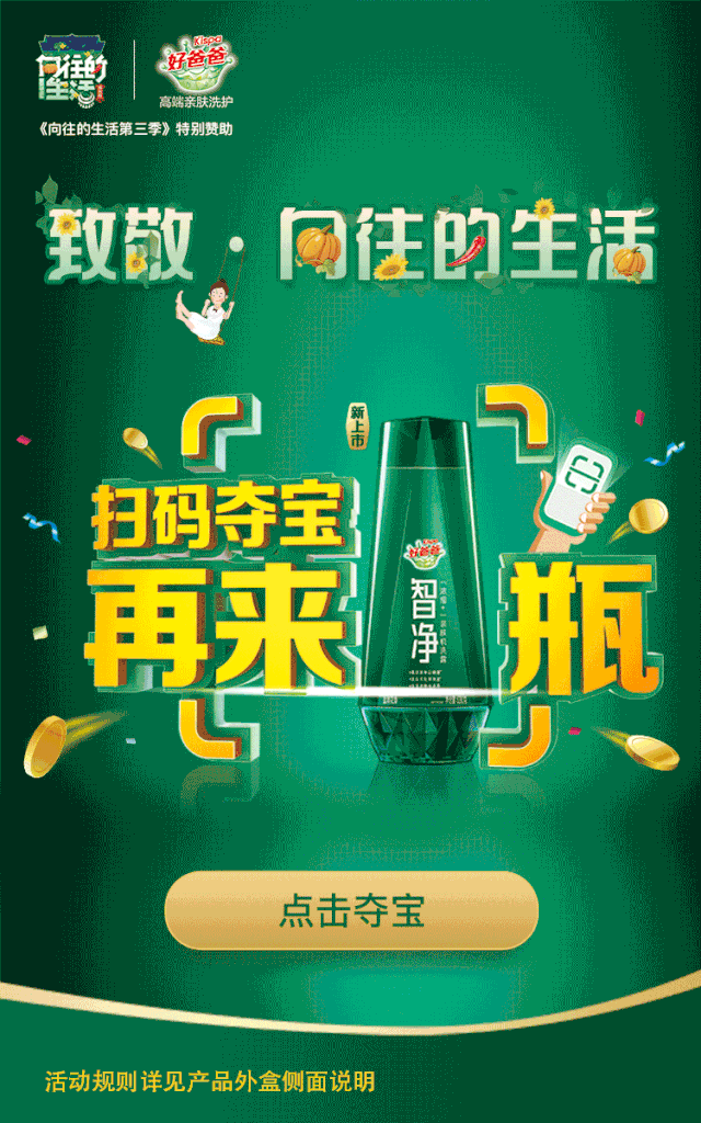 2019年5月1日至2019年11月30日,凡购买“好爸爸智净扫码夺宝 再来一瓶”产品,微信扫描箱内产品瓶身二维码,即有机会获得以下奖品!本活动综合中奖率100%