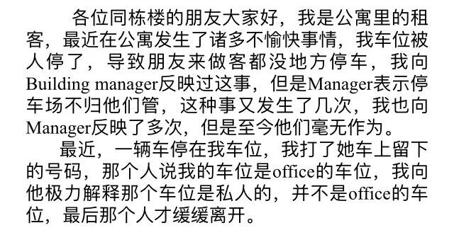发现自家车位被陌生车辆乱停的时候,Simon以为只是个小问题,找公寓管理员(building manager)反映就好了。