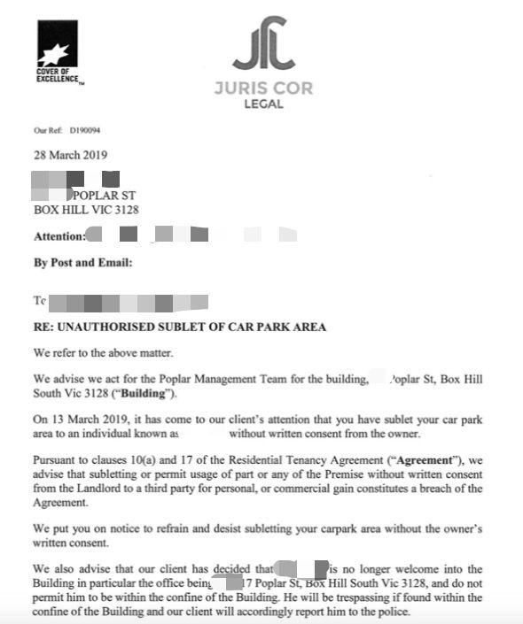 物业称,Simon在没有书面通知业主的情况下,私自把车位租给了朋友,违反了租房合同。