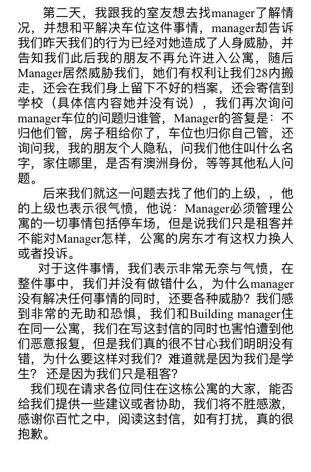 “她说不让我朋友以后再进入这幢公寓。还问了我朋友的名字、地址、学校、是否有澳洲身份等个人信息,说她已经报警了,还要给学校写信。