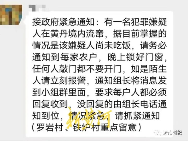 当晚,新黄河记者注意到一则网传“紧急通知”,称“有一名犯罪嫌疑人在黄丹境内流窜,据目前掌握的情况是该嫌疑人尚未吃饭,请务必通知到每家农户,晚上锁好门窗,任何人都不要开门。如是陌生人请立刻报警。通知组长将消息发到小组群里面……(罗岩村、铁炉村重点留意)。”