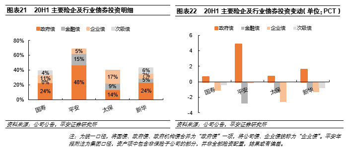 加配长久期国债和地方政府债,拉长资产久期。尽管债券配置各有侧重,但2019年以来,主要险企均以加配长久期政府债为主,总体来看,主要险企资产久期6年以上。根据半年报数据计算,从20H1政府债投资在总投资资产占比来看,国寿24%(较上年末+0.6pct)、平安48%(较上年末+4.8pct)、太保14%(较上年末+0.6pct)、新华24%(较上年末+1.6pct)。