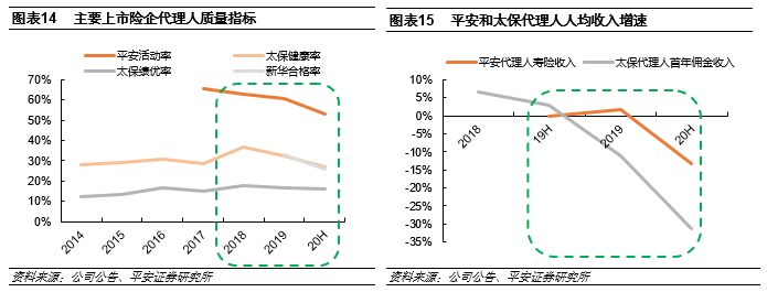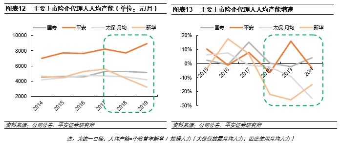 代理人质量普遍偏低,2018年以来人均产能呈下滑之势。主要上市险企人均产能平均约5400元/月,根据图表12,总体来看:平安>国寿>太保>新华。近年来新单增幅放缓、甚至出现负增长,导致代理人产能大幅下滑;其中新华增员幅度较大,产能降幅高于同业。