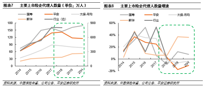 以2018年为分水岭,规模人力增速拐头向下。2017年,原银保监会下发134号文,规范人身险产品设计、快速返还型保险产品销售受阻,叠加高利率、高基数的影响,2018年开门红新单下滑显著。而此前开门红新单占比普遍高达50%,新单下降、收入下滑,加剧代理人脱落,导致2018年规模人力普遍下滑。2019年以来,战略选择的差异和新单表现的差异,导致平安、太保人力下滑,国寿、新华人力保持增长。截至20H1,国寿个险代理人达169万人(YoY+7%)、平安115万人(YoY-11%)、太保77万人(YoY-4%)、新华53万人(YoY+36%)。