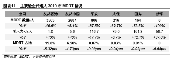 ②顶尖绩优:符合MDRT标准的人力,对年均收入、学历和从业经验均有要求。根据MDRT会员排行榜,太保2019年MDRT仅216人(YoY-62.7%)、在总人力中占比仅0.03%(YoY-0.04pct),涵盖MDRT、金玉兰、及19Q3开始推进的“百城千人计划”(100个城市选出共计1000个高质量代理人),预期三年后突破2000人。顶尖绩优的打造由多赛道推进。
