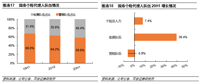 截至20H1,国寿个险代理人共计169万人(YoY+7%),其中营销队伍101万人(YoY-6%)、占比59.6%,收展队伍689万人(YoY+39%)、占比40.4%(YoY+8pct)。公司20H1完成个人业务和团体业务的切分,预计部分银保理财规划师已纳入收展队伍,使得收展队伍规模快速壮大。