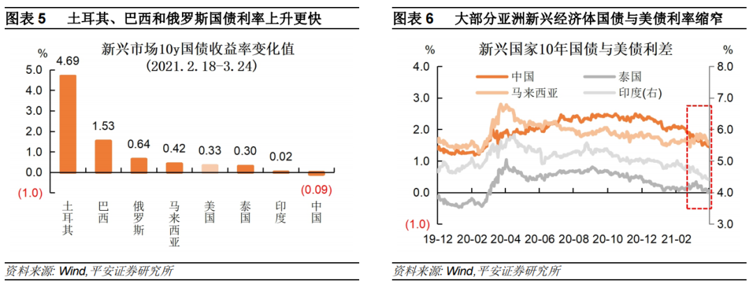 回到当下,考虑到美联储尚未正式提及“Taper”,目前新兴市场所受冲击虽然小于2013年的“紧缩恐慌”,但仍有略超预期的成分。美联储鲍威尔在今年3月25日接受NPR采访时提到货币政策的转向,但这并非正式场合,且用词十分克制。而且,新兴市场自今年2月中旬开始,就已经提前经历了类似2013年“紧缩恐慌”时期的波动。对比来看,2021年2-3月Bloomberg新兴市场资本流动指数下跌幅度约为2013年5-6月的1/2,MSCI新兴市场汇率指数降幅是当年的1/2,MSCI新兴市场(股票)指数跌幅已接近当年的80%。债市方面,本轮土耳其、巴西和俄罗斯主权债利率上行仍然“跑赢”美债,泰国、马来西亚等国债利率与美债仍保持较高同步性,而印度和中国国债仍具韧性。需注意的是,本轮土耳其和巴西国债利率增幅已经高于2013年,而中国、印度债市韧性强于2013年。换言之,从债市表现看,新兴市场国家之间的“抗压”能力出现了更加明显的分化。
