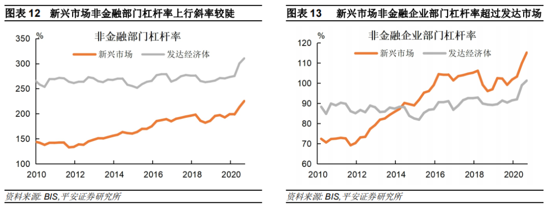 新兴市场杠杆率近十年来已经较快攀升,疫情后再度跃升。发达经济体的政府和居民杠杆率长期高于新兴市场,因而非金融部门杠杆率整体较高,但次贷危机后直至疫情前保持在250-280%区间,未出现趋势性上涨,2020三季度该数字升至310%。而新兴市场的非金融部门杠杆率,在近十年以来维持上行趋势,由2012年的130%左右上升至2020年疫情爆发前接近200%的水平,2020年三季度升至225%(图表12)。其背后主要是新兴市场非金融企业杠杆率的快速上行,2012年以来这一数字由70%左右,快速上升至2016年100%以上,且该杠杆率在2014年已经超过发达经济体(图表13)。2020年新冠疫情爆发后,新兴市场非金融部门杠杆率快速上行,甚至上升斜率比发达市场更陡峭。站在宏观杠杆率角度,新兴市场现在的偿债压力正在加大。