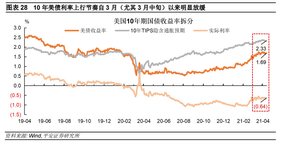 第二,前期美债利率上行已经释放了部分风险。10年美债利率可拆分为“实际利率”(10年TIPS利率)与“通胀预期”(名义利率-实际利率)(图表28)。其中,1)目前通胀预期已经反映得比较充分,3月中突破2.3%以后基本走平,在美联储的引导下(2021年预测均值为2.4%),未来通胀预期上行空间有限。2)美国实际利率上行亦有所放缓,3月中破-0.6%以后亦基本走平。发达经济体在疫情前长期保持“低利率、低增长、低通胀”的格局,不太可能仅依靠疫情后的财政货币刺激而彻底改变。此外,拜登基建计划虽有望抬升美国经济增长中枢,但需要在中期内逐步释放。市场对拜登基建的反应也相较“钝化”,例如10年期美债收益率仅在3月30日拜登基建公布后短期冲高(最高盘中破1.75%),但4月6日很快回落至1.7%下方(截至12日为1.69%)。综合来看,我们认为,2021年10年美债利率后续上行节奏可能放缓,继而对新兴市场的冲击可能相应减弱。