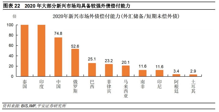 因此,截至2020年末,新兴市场短期外债偿付能力较高。泰国、印度和中国的外汇储备与短期未偿外债比值,在2020年底分别达到408.9、153.6和74.8;其余大部分国家外储与短期未偿外债比值至少在10倍以上;仅阿根廷(已经违约)和土耳其的比值较低(图表22)。整体看,至少在未来一年里,新兴市场整体性的外债违约风险较为有限。