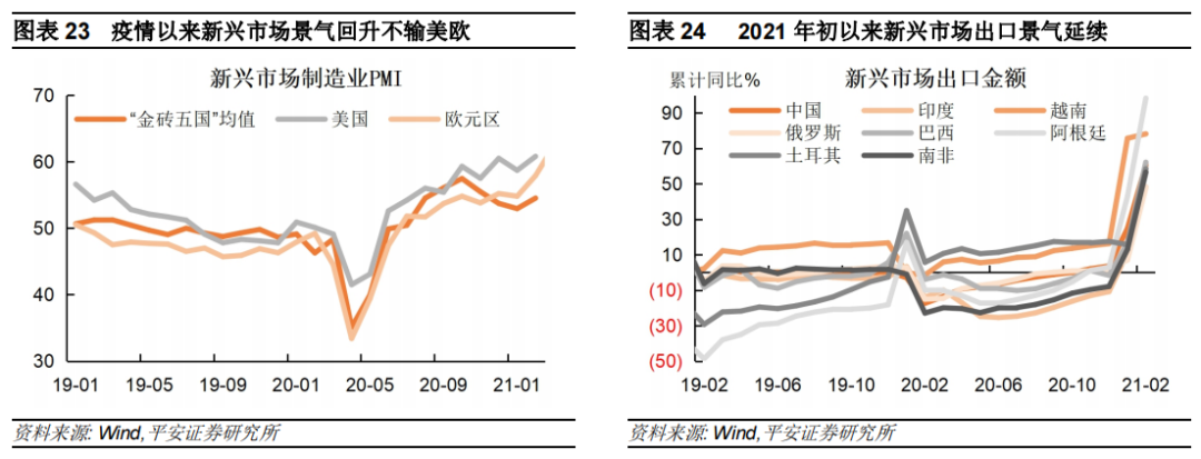 2020年新兴市场出口表现意外强劲,2021年出口景气有望延续。2020年下半年以来,大部分新兴市场(不仅是中国)出口表现“大放异彩”。土耳其、越南、泰国、中国、阿根廷、俄罗斯等新兴经济体,在2020年全年均实现了出口金额累计同比正增长,其中土耳其、越南、泰国的累计同比增幅均达到两位数。截至2021年2月,主要新兴市场出口累计同比基本维持50%以上的上涨(图表24)。