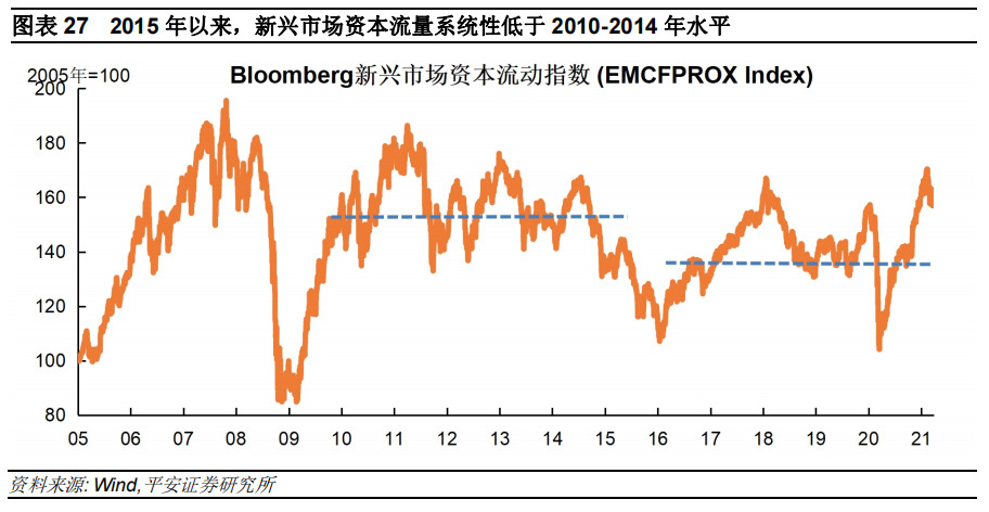 2015年以来,新兴市场资本流量系统低于2010-2014年水平。次贷危机后,美国等发达市场保持低利率、低通胀和低增长状态,而新兴市场经济增速快于发达市场,且中国基建和房地产周期创造了大量投资机会,吸引了国际资本的大幅流入。但2015年美联储开始加息后,叠加美国特朗普政府对全球化进程构成的一定破坏,新兴市场经济增速放缓,流入新兴市场的资金受到系统抑制。Bloomberg新兴市场资本流动指数(EMCFPROX Index)显示,2015年以后新兴市场资本流动中枢显著低于2010-2014年水平(图表27)。